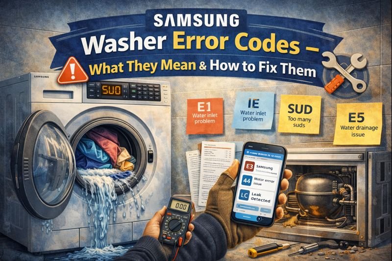 Is your Samsung washer flashing a mysterious code like 4E, UE, or DC? These codes are your machine’s way of telling you something’s wrong — and often, it’s a fix you can handle yourself.